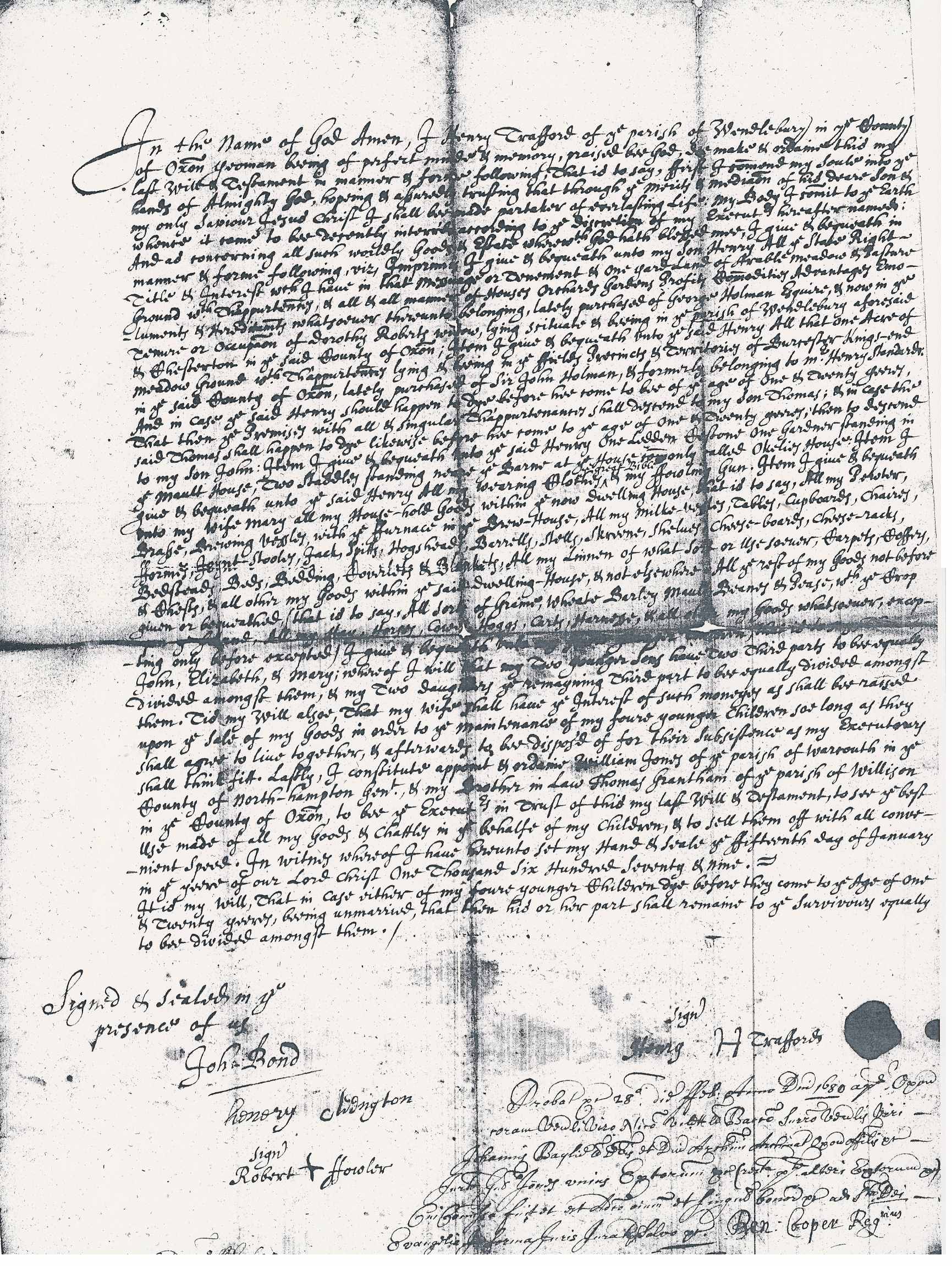 | Information pertaining to a section of the TRAFFORD family in Oxfordshire Background My interest in the TRAFFORD family started when I discovered the marriage, in 1808, of my great great great grandfather Thomas Harper and Ann TRAFFORD in St. Mary the Virgin, Kirtlington Oxfordshire. Ann was the daughter of John TRAFFORD and Mary CURTIS who married in 1766 and had six children between 1768 and 1784. Last of these were Sarah and Ann, christened together in 1784 and probably twin sisters. John was born about 1741, one of many years missing from the Kirtlington Parish Registers. His approximate date of birth can be deduced from his age (78) at death and burial in Kirtlington in 1819. At this time another John TRAFFORD and his wife Mary SIMONS were christening a number of children, of which one was John junior. This event cannot be confirmed by the Parish Register but is confirmed in John senior's will of 1768. John senior farmed a large holding in Kirtlington; a survey of the parish by St John's College in 1750 shows him to be tenant of two farms totaling 498 acres - easily the largest holding in the village outside that of his landlords. The Dashwood family were well into their procurement of virtually all the village. This link with the Dashwoods means that several deeds etc. involving John have been preserved in the Dashwood papers held by the Oxford Record Office. That will also gives a clue as to John senior's antecedents, he names his brother Henry TRAFFORD of Wendlebury as executor. As there are no TRAFFORD entries in the Kirtlington registers prior to John and Mary's marriage in 1735 and the baptism of their first child (Thomas) in 1737, it seems that John had moved in from elsewhere. Wendlebury is close by and his brother Henry lived there so it was the logical place to look next. As it happens Henry and Ann TRAFFORD had three children christened in St. Giles, Wendlebury; Henry, 1702, Mary, 1704 and John, 1706. These were an excellent match, the eldest son inheriting the property in Wendlebury, the younger branching out on his own. The only possible alternative John was born in 1679, surely too early to marry in 1735 and live to 1768, not impossible, but his brother Henry would have been 95 in 1768 - surely too old to be named executor of a will! Hence I have settled upon John son of Henry and Ann, c 1706 as being John senior in Kirtlington. Which gave me another problem - how to decide which Henry was which? Two Henrys were christened in Wendlebury; Henry son of William and Catherine, 1677; and Henry son of Henry and Mary, in 1673; either would be of a suitable age to be raising a family in the early 1700s. Coming to a conclusion about this link was more difficult and ultimately less convincing. The Henry TRAFFORD of Wendlebury who married Ann and had the three children detailed above is the only one of the two Henrys to raise a family in Wendlebury, he appears to be a man of some substance; he acts as churchwarden several times (a far more important post then than it is today), his sons Henry and John both appear to follow in his footsteps as minor landowners, farmers and (possibly) tradesmen. The will (transcribed) of Henry TRAFFORD (died 1680) leaves significant estate to his eldest son Henry (then only 6 years old) as well as making provision for his wife an other four children. The inventory of his goods and chattels shows a value of £377 12s 4d - over £40,000 in today's money, in addition to which he left several properties. As young Henry was left property in Wendlebury I feel it highly likely that he would remain in the village, and hence be the father of Kirtlington John sen. who became a significant landholder in his own right. I have not yet traced the other Henry, though his brother Jacob is believed to be the root of the TRAFFORD presence in Headington and Horspath. The aforesaid Henry and William TRAFFORD who were raising families in Wendlebury in the 1670s are the first to appear in the parish registers, as these registers go back considerably earlier I am once again looking elsewhere for their births. Henry married Mary GRANTHAM in Fringford in 1670, and named her brother Thomas as an executor to his will. Researchers are divided over the source of these two - one school of thought places them as the children of Robert TRAFFORD and Margaret RICHARDS who married in 1638 in Banbury. The timing is nice, but I have yet to see any evidence to support this theory which suggests that Henry and William were born in Wendlebury (though not no baptisms are registered there) and that a further mystery birth, that of Joan TRAFFORD, also took place in Wendlebury without baptism. Joan appears in the Wendlebury registers for the first time when marrying Edw. WHEELER in 1678. My own theory (which I prefer - naturally) is that Henry, William and Joan were all born in Adderbury, where christenings took place in 1619 (William), 1622 (Henry), 1647 (William) and 1649 (Joan). One William remains in Adderbury and is buried in 1671. The first two baptisms are the children of Richard TRAFFORD and Alice. The second being the children of William (presumably c 1619). My theory has Henry migrating to Wendlebury, where he has settled by 1665 (Hearth Tax returns have him paying tax on 7 hearths, the largest contribution in the village). As a successful farmer, and possibly innkeeper (he certainly left a brewery to his heirs) he was able to offer employment to his nephew William, and perhaps to Joan also. If this William and Joan are the children of William who was buried in Adderbury in 1671 then that death is an added reason to move to Uncle Henry's. Hence William comes to settle in Wendlebury and Joan, whether living in the village or just visiting, meets her future husband. And that is as far as I go - I feel that it must be possible to demonstrate a link back to the Banbury TRAFFORDs of the mid-16th century, but cannot show one yet. The TRAFFORDs merit passing mention in the Victoria Coun